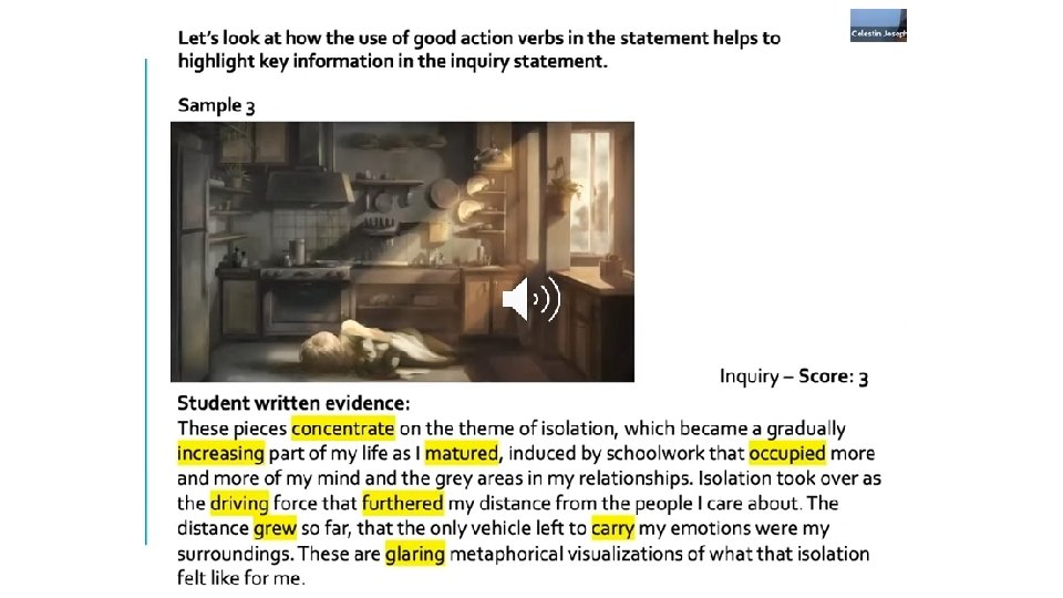 You'll have 1200 characters (not words) to make strong connections between the visual evidence you are seeing in the work and the words used in writing. Does is just RELATE (score of 2) or IDENTIFIES & GUIDES the viewer (score of 3) Do NOT make it BROAD. Write as a statement – with confidence. Identify important components (point out, discuss, list) Give examples of VISUAL EVIDENCE by referring to a specific