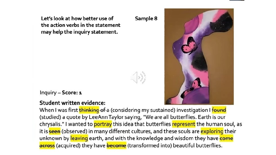 Your EXPERIENCES inform your thinking and your art making. Those experiences spark questions that guide your investigation. Using clear, concise words (and ACTION VERBS) get to the point about the statement you want make about your art. Observe the CHANGES being made in your work. What are the IMPORTANT components in your work?
