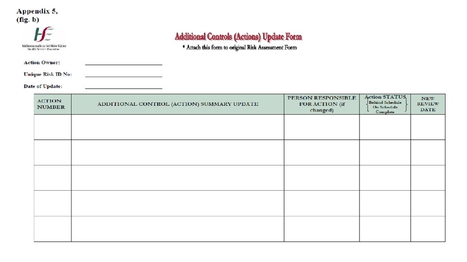 ( ACHS : Risk Management & Quality Improvement Handbook, 2013) Number (No) Nomor referensi unik untuk setiap risiko yang diidentifikasi Risk Area Bagaimana atau di mana risiko itu diidentifikasi Risk Description Deskripsi risiko dan kemungkinan dampaknya terhadap organisasi / orang Action Tindakan yang diperlukan untuk mengelola tugas Severity Tingkat di mana kepentingan organisasi / orang akan dirugikan oleh realisasi risiko Probability Probabilitas realisasi risiko Risk Rating Risiko Keparahan x probabilitas memberikan 'peringkat risiko' dan memungkinkan penentuan prioritas Eliminate, reduce or tolerate Menghilangkan, mengurangi atau menoleransi Keputusan tentang manajemen risiko yg teridentifikasi Start date / Due date Tanggal mulai / Tanggal jatuh tempo / Biaya Ditinjau secara berkala / Cost
