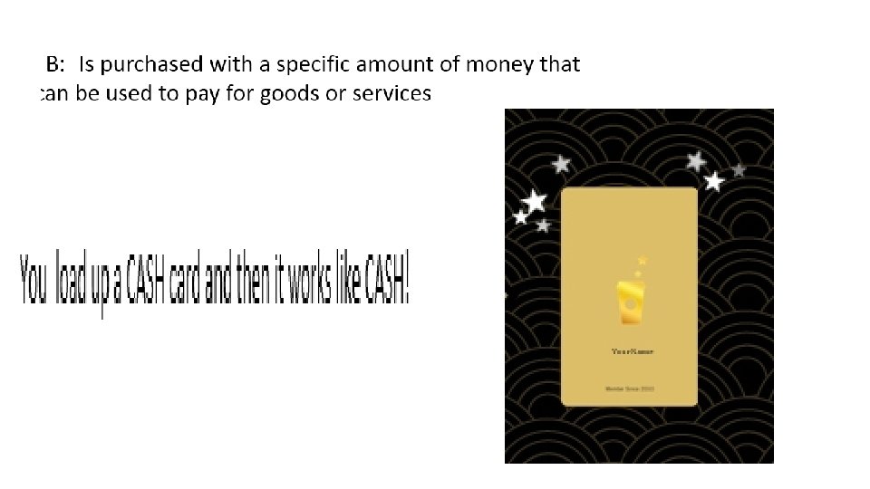 Question : A cash card generally: A: Can be used in the same way that someone uses a check to pay bills by mail B: Is purchased with a specific amount of money that can be used to pay for goods or services C: Is the same as a credit card which means you can use it to pay the minimum on a bill D: Is the same as a debit card and is always linked to a specific checking account