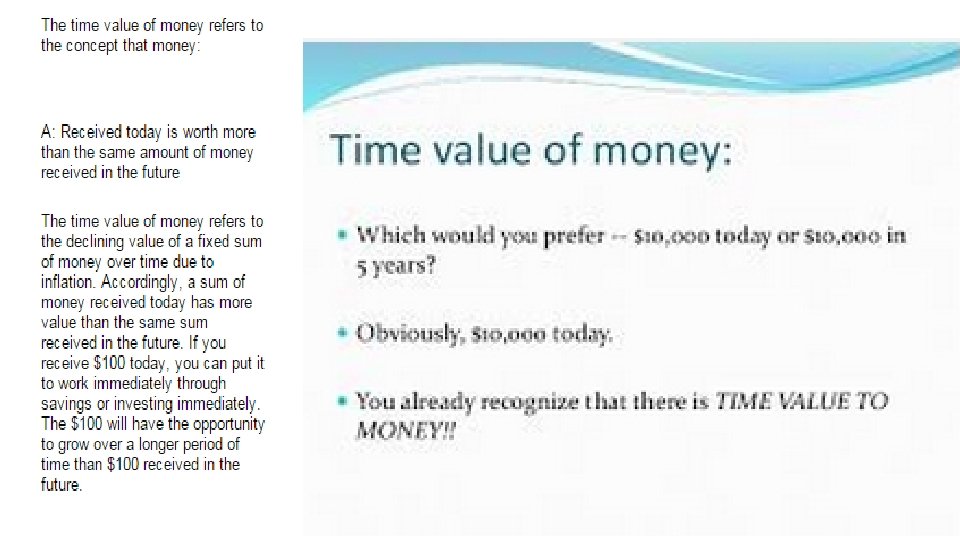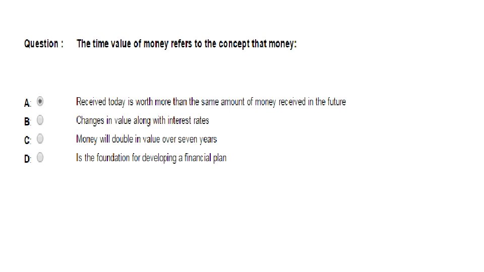 B: The time value of money Reason : The time value of money is the concept that money received today is worth more than the same amount of money received in the future. If you receive $100 today, you can put it to work immediately through savings or investing immediately.