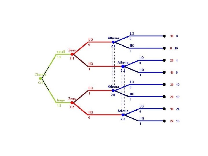 Zeus and Athena • Zeus Music is a market leader in producing a modern audio equipment. • Athena Acoustics is a smaller but very innovative firm • Both firms have invented a new hexaphonic sound system of a total audio surrounding. (You hang a guy at some height and put 6 speakers around him) • There is uncertainty about the size of a market. – There is 50 -50 chance of small ($24 mln profits) and big ($40 mln profits) market • The two firms have to decide whether to launch a highest quality audio system designed for a very demanding customers or a cheaper system designed for less demanding customers.