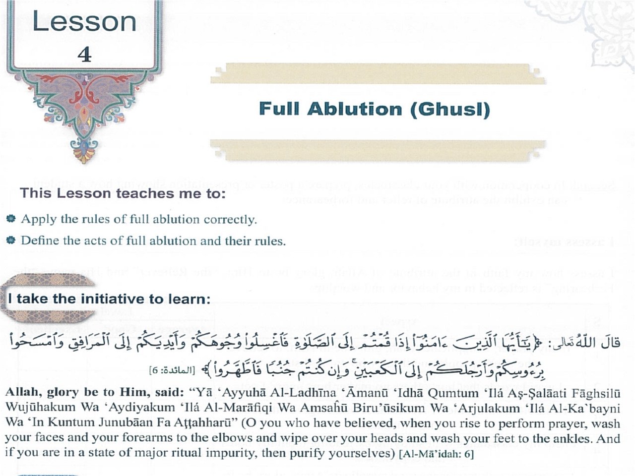 Student’s activities Washing all the body with pure water while having the intention to do so. Wrong. She has to perform full ablution after converting to Islam He must perform full ablution due to the semen, then he can pray. She has to perform full ablution due to her period, then she can pray He should perform dry ablution, then prays