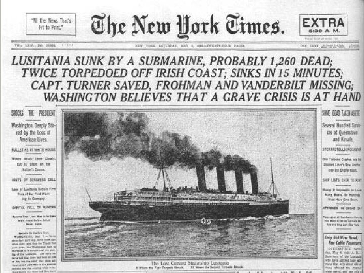 • May 7, 1915, the Germans sunk the Lusitania which was British passenger liner. • Germans believed it was carrying contraband (weapons) to the British. • Killed 1, 198 civilians including 128 Americans. • U. S. and other countries outraged towards Germany because of “unrestricted submarine warfare”. • US believed the Germans had violated