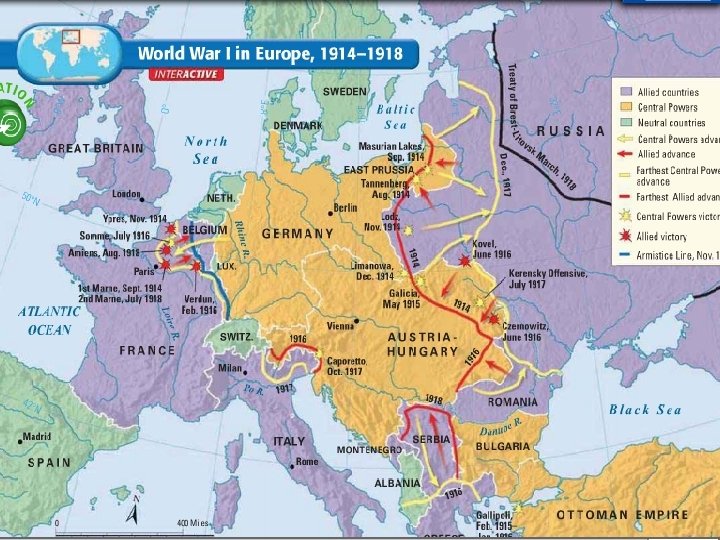 Review �What does M. A. N. I. A. stand for? �What nations were in the Triple Alliance? �What nations were in the Triple Entente? �Who were the Allies? �Who were the Central powers? �What assassination started the war? �Where did it occur? �Why were causalities so high in WWI? �On what country’s border did most of the fighting take place?