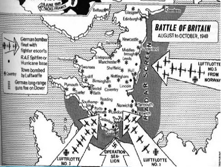 Battle of Britain 1940 -41 � Germany attempts to invade the British Isle (operation sea lion) � Turns Luftwaffe loose � British cities heavily bombed � Citizens take cover in subway tunnels � Protected by radar