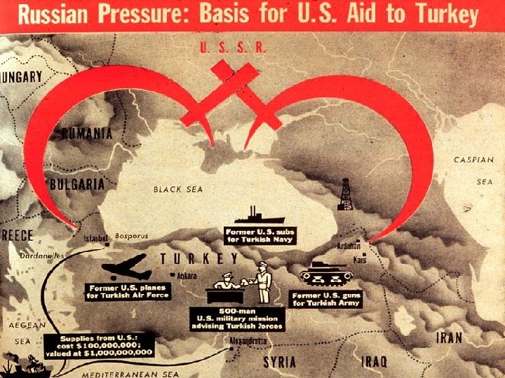 Truman Doctrine • US and Britain need to prevent communism in Greece and Turkey, but Britain broke US takes charge • March 1947, Truman and Congress allocated $400 M in economic and military aid to Turkey and Greece • “It must be the policy of the US to support free peoples who are resisting attempted subjugation by armed minorities or by outside aggressors. ” Truman Doctrine – policy of providing aid to free nations threatened by internal/external opponents