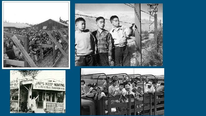 Japanese-Americans ● FDR issued Exec. Order 9066 in 1942 - created war zones where anyone may be removed for any reason ● Over 100, 000 Japanese immigrants and citizens were forced to move from the west coast ● The War Department created internment camps for people of Japanese heritage