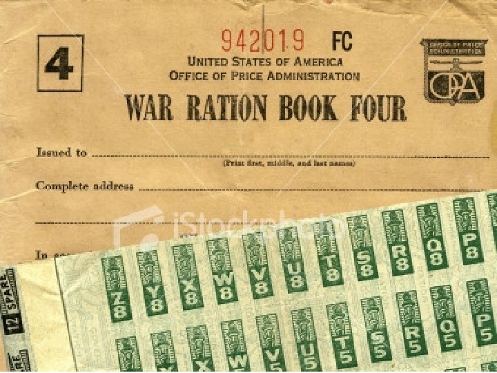 Red Stamp; Blue Stamp � "Red Stamp" rationing covered all meats, butter, fat, and oils, and with some exceptions, cheese. �Each person received points with expiration dates to follow. �"Blue Stamp" rationing covered canned, bottled, and frozen fruits and vegetables, plus juices and dry beans; and such processed foods as soups, baby food and catsup. �Each family was given a “War Ration Book. ” �Each stamp allowed the purchase of goods in the amount and time chosen. Each family was guaranteed a fair share.