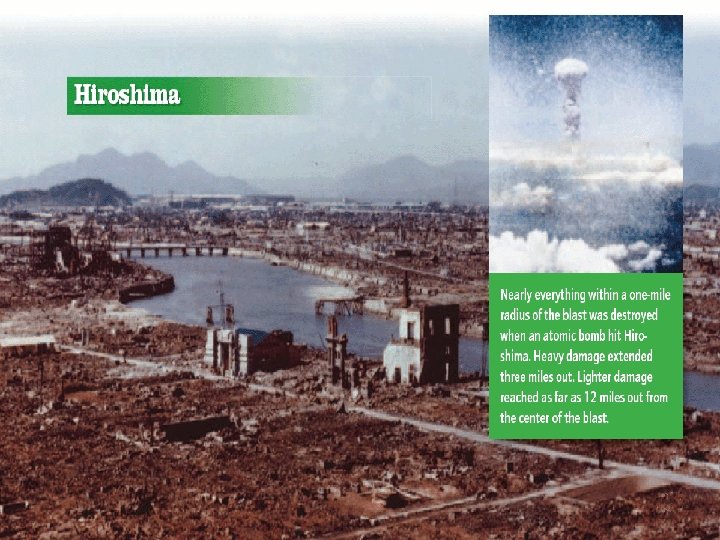 Drawbacks to dropping the bomb �Civilian Casualties; Women and Children, elderly �Long lasting effects; Nuclear fallout, cancer, defects �Psychological effects �Monetary damage �Japan had contacted the Soviets about surrendering, as long as they could keep their Emperor �Creation of the Atomic / Nuclear age and the