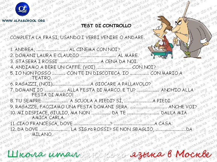 WWW. ALFASCHOOL. ORG TEST DI CONTROLLO 1) CHIAMI UNA TUA AMICA CHE ABITA A MILANO. DICI. . . a) Domani vado a Palermo b) Domani vengo a Palermo 2. I TUOI AMICI TI INVITANO A CENA A CASA LORO. DICI. . . a) Certo, vado con piacere, grazie. b) Certo, vengo con piacere, grazie. 3. CHIAMI LA TUA MAMMA. DICI. . . a) Mamma, vengo domani da te, va bene? b) Mamma, vado domani da te, va bene? 4. CHIAMI LA TUA MAMMA CHE ABITA NEGLI USA. DICI. . . a) Mamma, domani vado a cena con Roberto! b) Mamma, domani vengo a cena con Roberto! 5. INVITI A PRANZO I TUOI AMICI. DICI. . . a) Ragazzi, andate da noi domani per pranzo? b) Ragazzi, venite da noi domani a pranzo? 6. INVITI UN TUO AMICO AL CINEMA. DICI. . . a) Dai, vieni con me! b) Dai, vai con me! 7. INCONTRI PER STRADA UN TUO COLLEGA. DICI. . . a) Ciao Marco! Dove vai? b) Ciao Marco! Dove vieni? 8. CONOSCI UN RAGAZZO STRANIERO. CHIEDI. . . a) Da dove vai? b) Da dove vieni? 9. PARLI CON UNA TUA AMICA DI LAVORO. DICI. . . Sai, domani io e mio marito andiamo al mare. b) Sai, domani io e mio marito veniamo al mare 10. NON SAI COME TORNARE DALL’AEROPORTO. CHIAMI UN TUO AMICO. CHIEDI. . . a) Giuliano, vai a prendermi all’aeroporto? b) Giuliano, vieni a prendermi all’aeroporto?