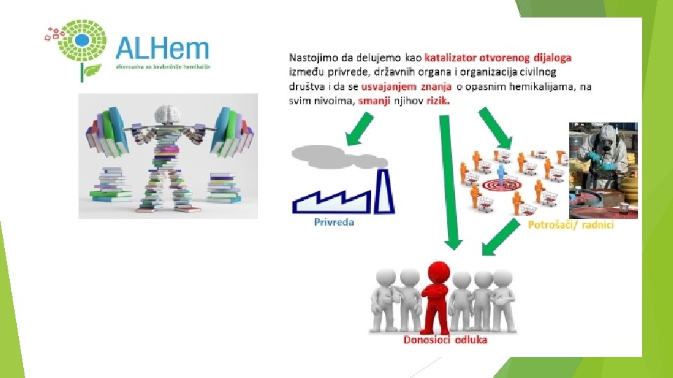 O nama ALHem je neprofitno udruženje, odnosno organizacija civilnog društva, osnovana 2013. godine, koje okuplja stručnjake sa višegodišnjim iskustvom u oblasti bezbednog upravljanja hemikalijama. ALHem je jedinstvena organizacija civilnog društva u ovoj oblasti u Republici Srbiji, a prema našim saznanjima i u regionu. ALHem koristi naučno proverena saznanja o štetnosti određenih hemikalija, kao i o načinima za njihovu zamenu i bezbedno upravljanje. ALHem nastoji da društvo prihvati ključne principe: predostrožnost, zamenu sa bezbednijim alternativama, zagađivač plac a i pravo javnosti da zna.