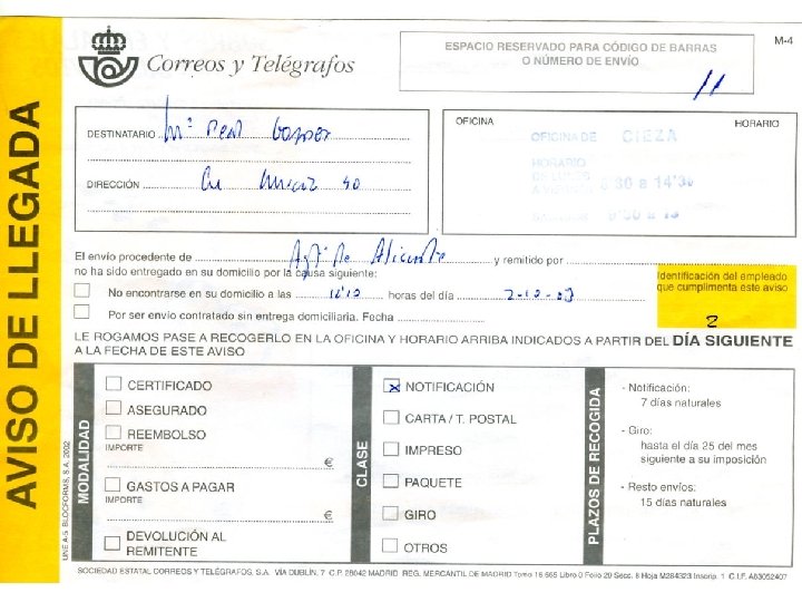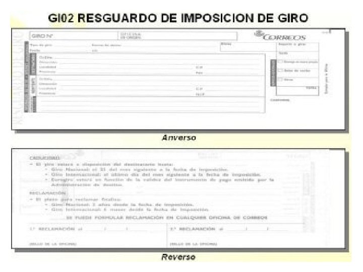 Garantías y plazos de reclamación (máximo 4 meses) • Para percibir el pago de una indemnización es “imprescindible” presentar el justificante del pago del envío y son: Resguardo de imposición. En caso de pérdida del resguardo, certificación de la oficina de depósito. Fotocopia compulsada del recibo de imposición. Las indemnizaciones se harán efectivas mediante Giro Urgente o transferencia bancaria. 30 € Carta certificada, paquete azul… 50 € Postal Exprés Fin