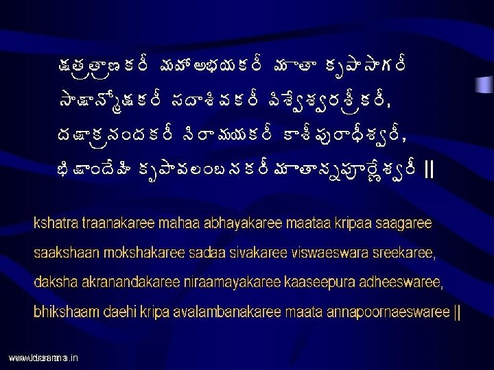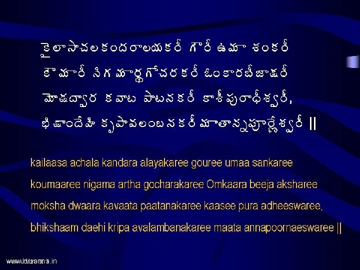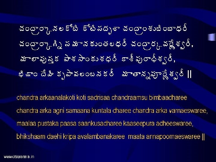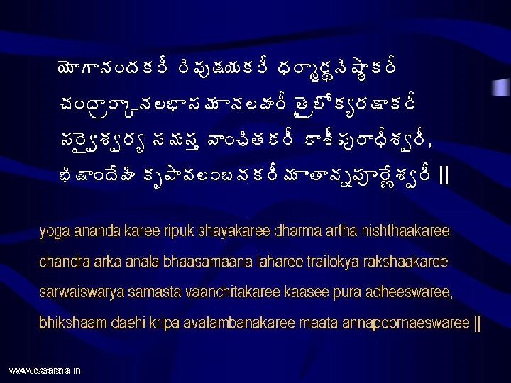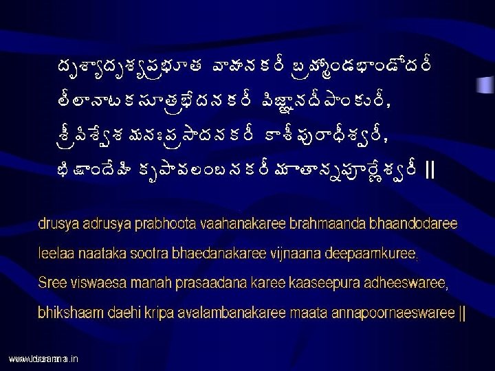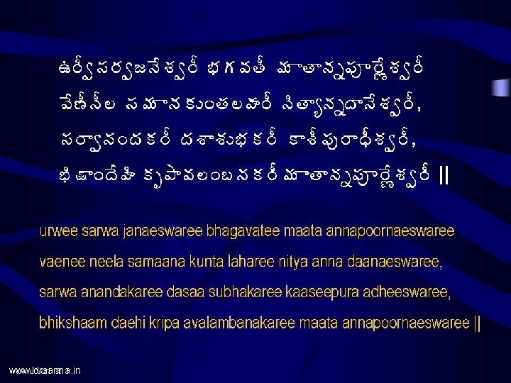 www drsarma in www drsarma in Annapoorna Astakam Slides: 17 Download presentation www. drsarma. in www. drsarma. in • ªÄë¥ÁúÁ×Ï� Á§Á ¤Á� Á©Áœ åžÁ � ÁÇœÁ • €þÁä¡Áõ§ ß «ÁÛ� Á¥÷ Annapoorna Astakam Srimad Sankaraacharya’s Creation Dr. Sarma@works €þÁä¡Áõ§Êß ¬Áž ¡Áõ§Êß ªÁÏ� Á§Á± 뛩Á¨ì¤Ê, ü ÚþÁ©Ë§ � Áê ¬ÃžÁãê§ÁáÏ ¤Ã¯ Ï žÊÿà úÁ ± §ÁíœÃ || Annapoornae sadaa poornae Samkara praana vallabhae, Jnaana vairaagya siddhyartham bhikshaam daehi cha Paarwati || www. drsarma. in ¥Á œ úÁ ± §ÁíœÄžÊ©Ä ¡Ãœ žÊ©Í ¥ÁÿʪÁí§ÁÐ, £ ÏŸÁ© Ð ªÃ©Á¤Á� àªÁÖ ¬ÁížÊªÍ ¤ÁÅ©ÁþÁœÁë¦Á¥÷ || maataacha paarwatee daevee pitaa daevo mahaeswarah, baandhavaah Siva bhaktaascha swadaeso bhuvana trayam || www. drsarma. in ‚œÃ ªÄë¥ÁúÁ×Ï� Á§ ú §Áê ©Ã§ÁúÜÁ¥ÁþÁä¡Áõ§ ß «ÁÛ� Á¥÷ This concludes the Annapoorna astakam by Sri Sankaraacharya www. drsarma. in www. drsarma. in