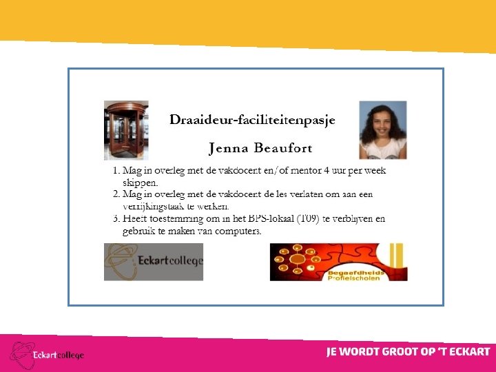 Begeleiding “Draaideurleerlingen” Voortgangsgesprekken Ø Ø Ø Hoe gaat het? Evaluatie BPS-pas-urenoverzicht /rapport Voortgang project? Waar loop je tegenaan? Wat zou je willen? Medewerking vakdocenten? Ø Maar vooral een luisterend oor en laten merken dat men gezien en begrepen wordt!