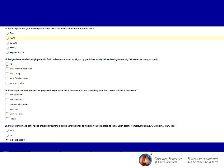 ‘U 30’ Outflow of 2008 Higher Qualified Personnel (HQP) Report • Suggestive evidence in the US that as many as 1/3 of earth science graduates end up working outside the profession and most of those disappear in the first 10 years after graduation • HQP report showed anticipated need for huge numbers of earth scientists especially in Mining and Environmental sectors in the next 5 -10 yrs • Conclusion: focus on ‘U 30’