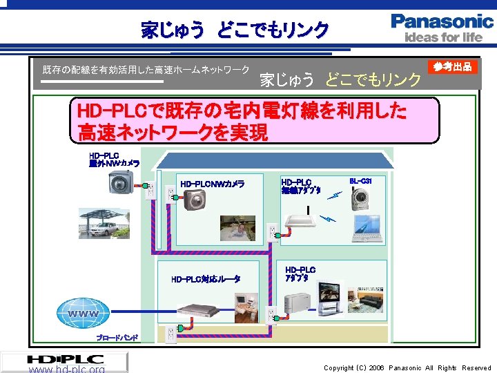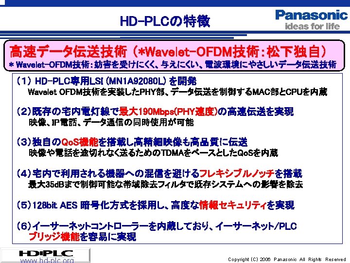 www. hd-plc. org HD-PLC説明資料 2006年 1月31日 パナソニックコミュニケーションズ(株) PLC推進室 宮崎 富弥 Copyright (C) 2006 Panasonic All Rights Reserved