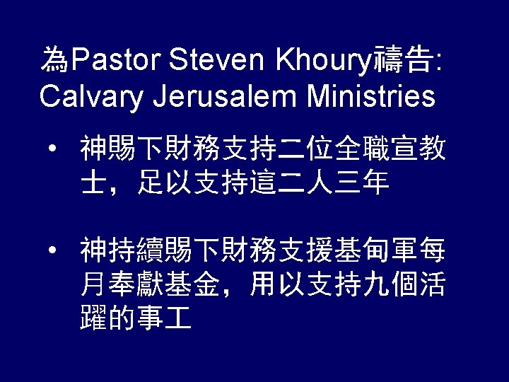 www holylandmissions org Pastor Steven Khoury Calvary Jerusalem Slides: 15 Download presentation www. holylandmissions. org Pastor Steven Khoury: Calvary Jerusalem Ministries email Steven@holylandmissions. org 為Karen and Jerry Ellard禱告 Arise Israel; King of Kings 為Pastor Stephen Apple禱告 Calvary Chapel Tel Aviv
