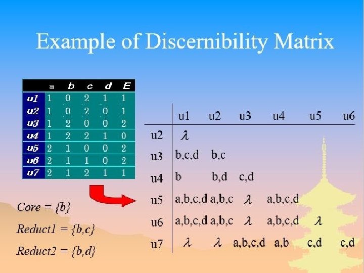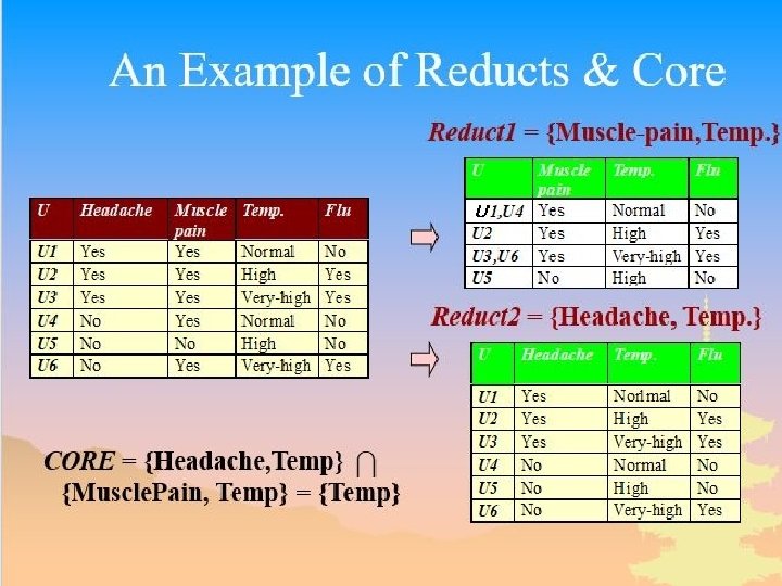 Information System REDUCTS a b c d f x 1 x 2 0 0 L R 0 1 L L 0 1 x 3 x 4 0 0 L R 0 1 L L 0 1 x 5 1 R 0 L 2 x 6 1 R 0 L 2 x 7 2 S 2 H 3 x 8 2 S 2 H 3 Discernibility Matrix x 1 x 2 x 3 x 4 x 5 x 6 x 7 x 8 bc bc ab ac abcd abcd abcd x 1 x 2 x 3 x 4 x 5 x 6 x 7 x 8 Discernibility Function: f(a, b, c, d) = (b + c) (a + b + c + d) (a + c) =(b + c) (a + b) (a + c) = (ba + bb + ca + cb) (a + c) = (b + ca) (a + c) ba + bc + ca (b=L) (f=0); (a=0)*(b=R) (f=1); Reducts: {b, a}, {c, b} ……