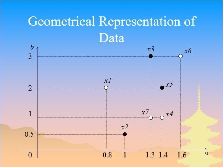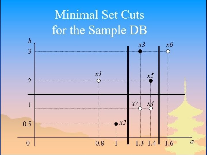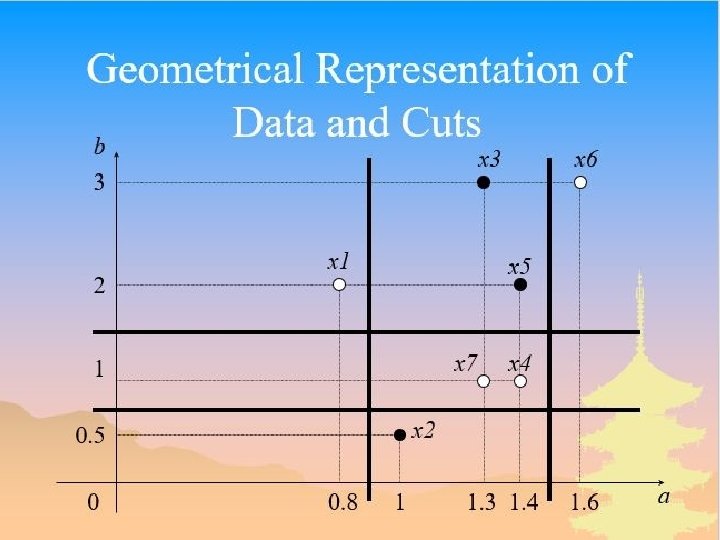 Discretization of numerical attributes X x 1 x 2 x 3 x 4 x 5 x 6 x 7 a 0. 8 1 1. 3 1. 4 1. 6 1. 3 b 2 0. 5 3 1 2 3 1 d 1 0 0 1 1 Va = [0, 2), Vb = [0, 4) p 1 p 2 p 3 p 4 Dom(a) = {0. 8, 1, 1. 3, 1. 4, 1. 6}, G(x 1, x 2)=p 1+q 2 G(x 1, x 3)=p 1+p 2+q 3 G(x 1, x 5)=p 1+p 2+p 3 G(x 2, x 4)=p 2+p 3+q 1 G(x 2, x 6)=p 2+p 3+p 4+q 1+q 2+q 3 G(x 2, x 7)=p 2+q 1 G(x 3, x 4)=p 3+q 2+q 3 G(x 3, x 6)=p 3+p 4 G(x 3, x 7)=q 2+q 3 G(x 4, x 5)=q 2 G(x 5, x 6)=p 4+q 3 G(x 5, x 7)=p 3+q 2 x 1, x 3 x 1, x 5 x 2, x 4 x 2, x 7 x 3, x 6 x 5, x 6 q 1 q 2 q 3 Dom(b) = {0. 5, 1, 2, 3} P 1 P 2 1 1 P 3 P 4 Q 1 Q 2 Q 3 1 1 1 1