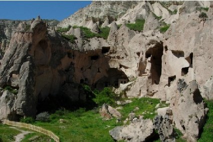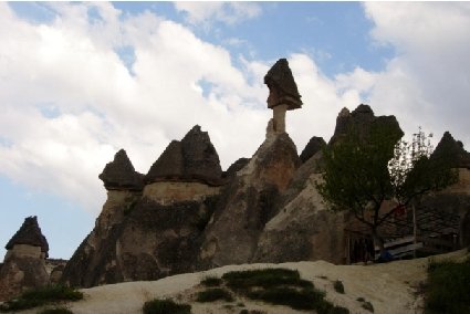 Pamukkale « Le château de coton » Site naturel d’une extraordinaire beauté. Pamukkale est une tufière entièrement élaborée par les eaux chaudes qui s'écoulent des entrailles de la montagne. Les eaux saturées de sels minéraux et de gaz carbonique. Ce dioxyde de carbone, en se libérant dans l'air, fait précipiter le carbonate de calcium contenu dans l'eau, qui se dépose, sous forme pâteuse, sur les flancs de la colline et durcit ensuite lors de l'évaporation de l'eau. Ce phénomène naturel laisse des couches blanches sur la pierre, ce qui donne à la montagne une apparence de forteresse de coton ou d’une chute d’eau gelée.