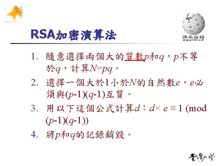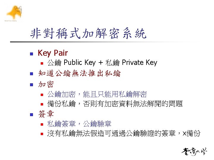 M: Message(明文) C: Cipher(密文) n 公鑰加密/私鑰解密 n n M < N, M is message, ex. M=72(明文) C=Enc(72, 7, 187)= 727%187=30 (密文) M=Dec(30, 23, 187)=3023%187=72 (明文) 私鑰簽章/公鑰驗章 n M < N, M is message, ex. M=72(明文) C=Enc(72, 23, 187)= 7223%187=183 (簽章值 n M=Dec(183, 7, 187)=1837%187==72(驗章) n )