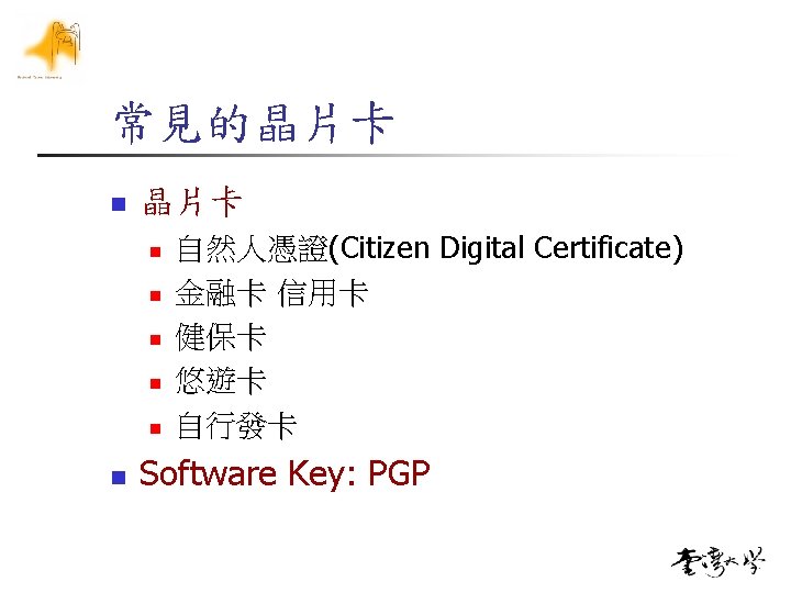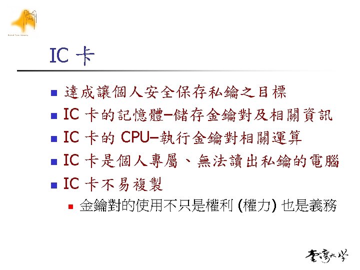 n Key Gen n n n n p=17, q=11, N=187 Phi= (17 -1)(11 -1)=160 Factor(phi)=25*5 E={3, 7, 11, …}, let e=7 d*e==1(%phi), 7 d=160*i+1 161=7*23, d=23 Public Key PU(7, 187) 公布之 Private Key PR(23, 187) 妥善保存 n n n 磁片+軟體保護 晶片卡+PIN PGP