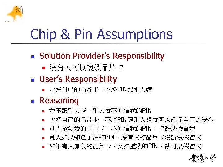 Reference n [clchen] n n [電子簽章法] n n n 中華電信 謝東明博士 Q&A n n 90 -11 -14總統府公告,91 -04 -01開始施行 http: //www. moea. gov. tw/~meco/doc/ndoc/s 5_p 05. htm 電子簽章及電子憑證應用介紹, Link n n 台大資 陳俊良老師, 台大醫院PKI財委會說明, 093 -04 -08 http: //grca. nat. gov. tw/qanda 2. htm [Gutmann] n http: //www. cryptoapps. com/~peter/part 2 a. pdf