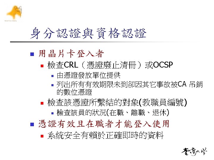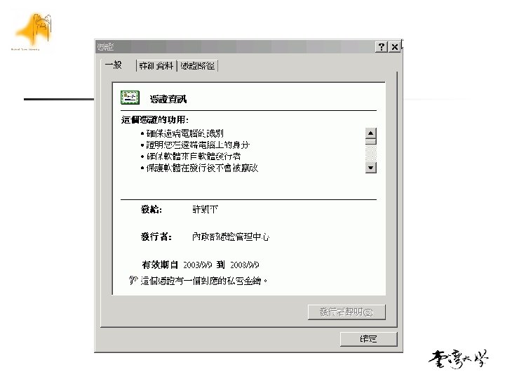 自然人憑證 Subject Name Value 許凱平 Issuer Name 內政部憑證管理中心 2. 5. 29. 9 *3698 Right(idno, 4) RFC 822 Name kphsu@ntu. edu. tw email Cert. SN 00 A 4 363 A CAB 7 CF 06 C 7 C 8 AC 22 71 EC 67 A 9 14 Field n idno: Citizen’s ID Number Remark unicode