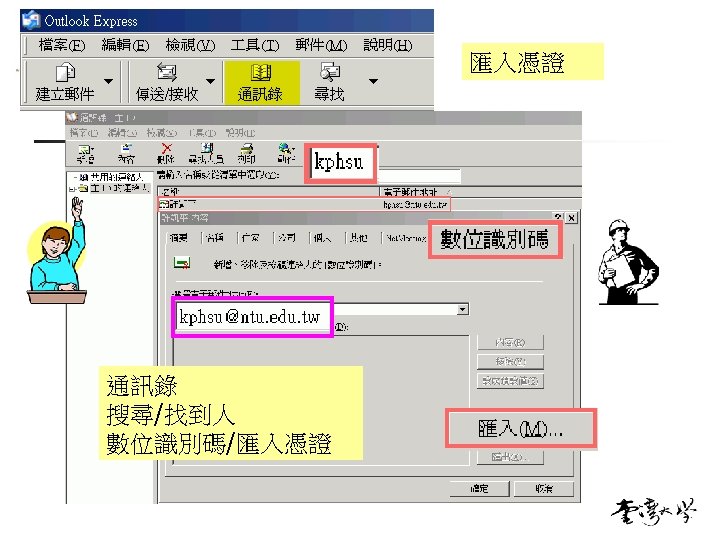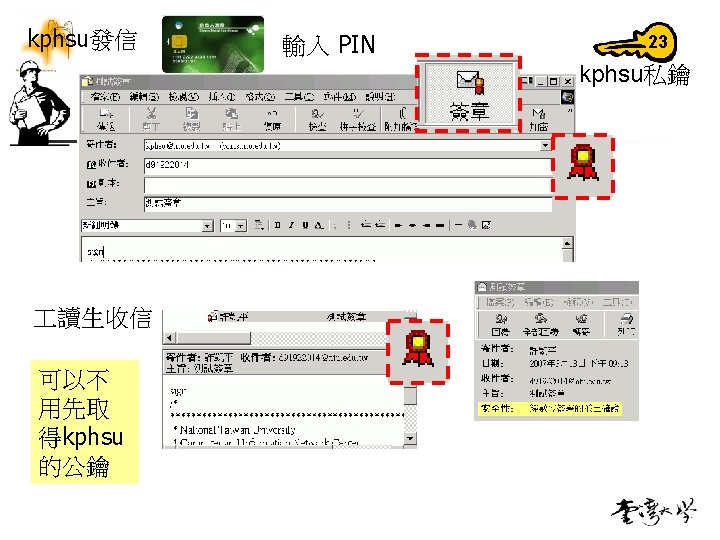 取得kphsu的公鑰 讀生 secrete 7 kphsu公鑰 kphsu@ntu. edu. tw secrete 用私鑰解密 驗章 23 kphsu私鑰