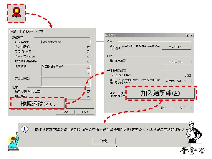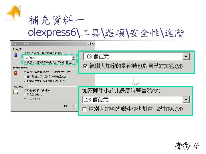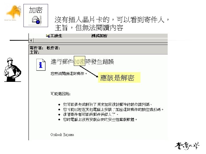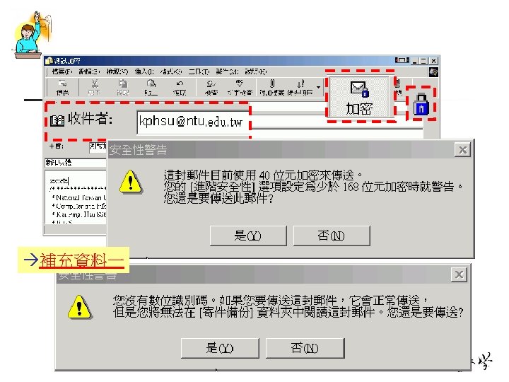 在電子郵件的應用 n 請參考中華電信安全電子郵件介紹的講義 n n Outlook Express, Outlook 2003, Thunder. Bird and Notes Mail 精簡版 n n Step 1 Step 2 Step 3 Step 4 取得憑證 匯入至Outlook Express 送加密信給kphsu, kphsu. 公鑰 kphsu簽章 kphsu. 晶片卡