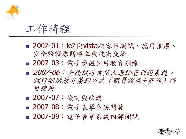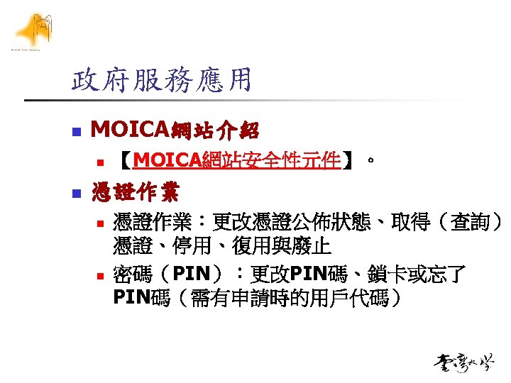 CSP: Cryptographic Service Provider n 安裝Safe. Sign CSP http: //moica. nat. gov. tw/html/download_1. htm n 開始/程式集/Safe. Sign Version 1. 0. 8/ (1) Certificate Registration Utility (2) Intstall Safe. Sign in Netscape (3) Token Management