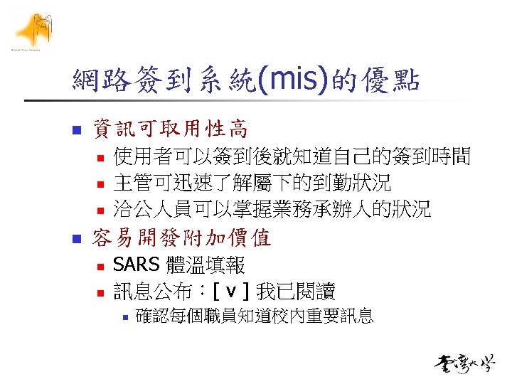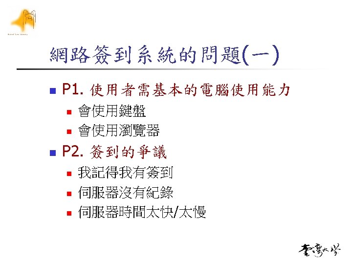 簽到時間的秒差 n 使用者進入簽到首頁login. asp n n threshold t 0= Server. get. Time() t 1= Client. get. Time() if t 1 -t 0>threshold n n 要求使用者使用校時軟體 sign. asp n 簽到時間為t 0, 並紀錄t 1作為參考