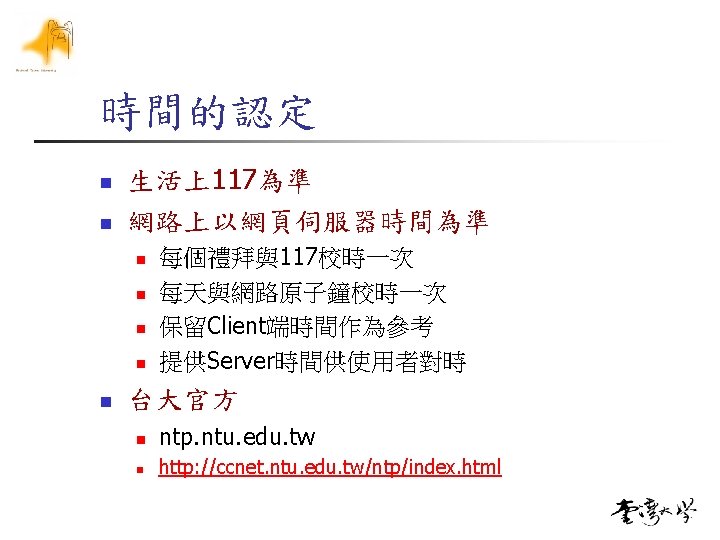 時間的同步問題(一) n Win XP, Win 2003 n n 控制台/日期和時間/網際網路時間 時間伺服器 n n ntp. ntu. edu. tw (140. 112. 2. 189) 140. 113. 1. 1 time. windows. com time. chttl. com. tw