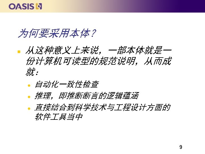 Why Use an Ontology? Ontologies allow the explicit specification of the multiple possible interpretations of concepts so that people can recognize commonalities and differences in the semantics of the concepts that they use. 8