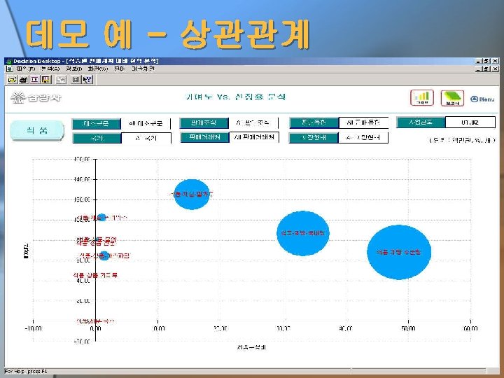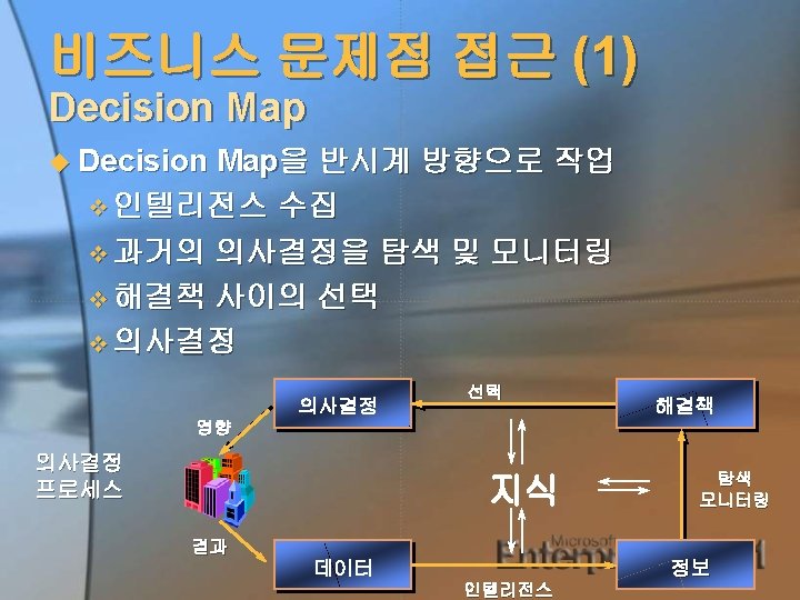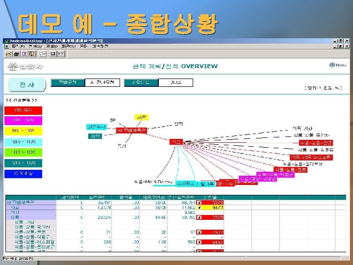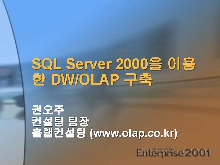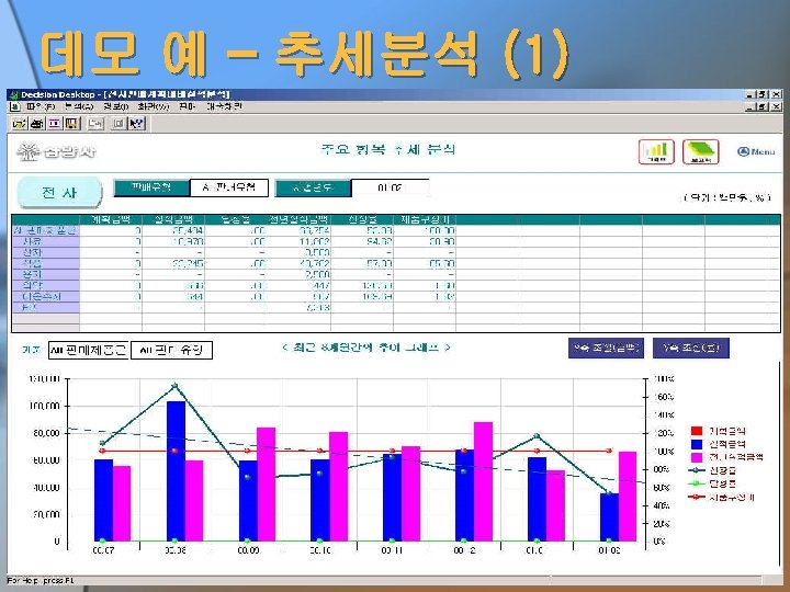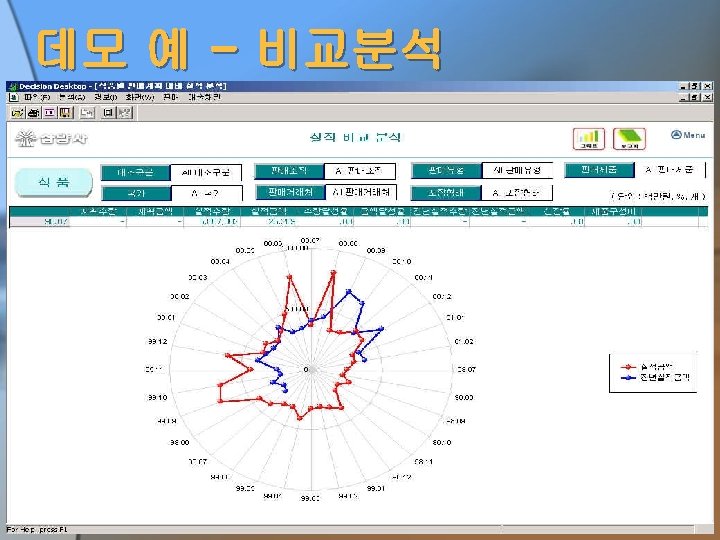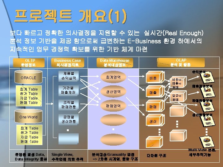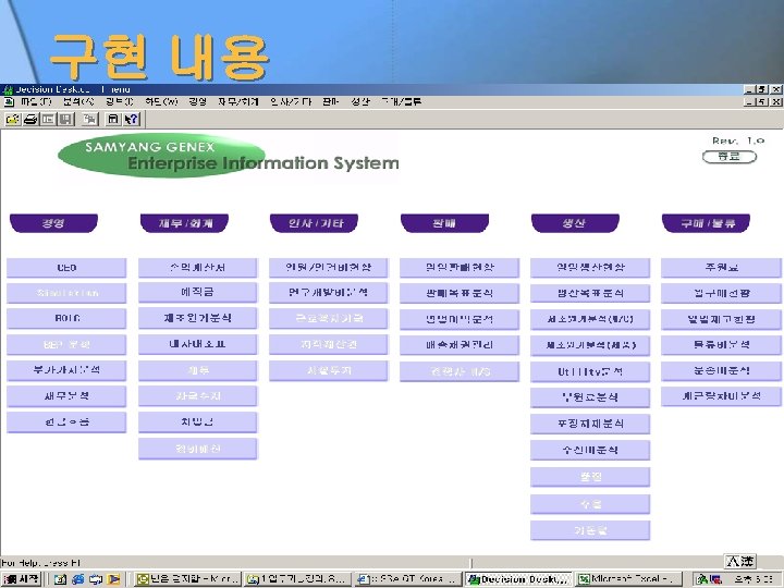 시스템 구성도 SQL Server OLTP Facts Dimensions DSA Analysis Services Cube Excel DTS Decision App Server Decision Desktop ERP Server EIS Server Client • • • 200 Mhz이상 • Windows 98/2000 HP 9000/K 260 UNIX Oracle 7. 3. 3 BPCS 6. 0. 04 Compaq Proliant ML 570 R XN/700 Windows 2000 Server SQL Server 2000 Decision App Server • Decision Desktop