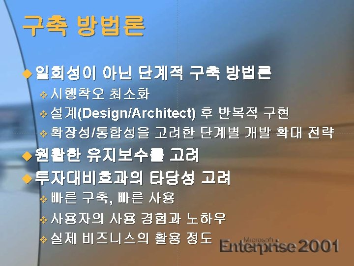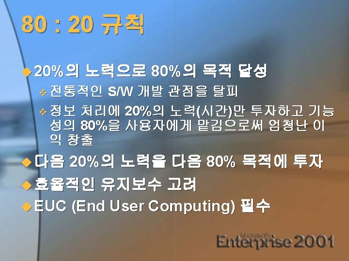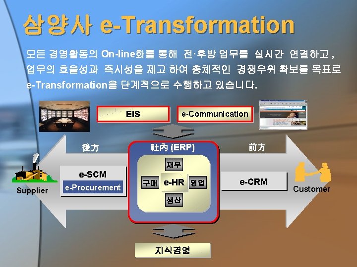 시스템 구성도 Legacy 시스템 Data Warehouse Server (COMPAQ ML 5700) End Users DW Server UNIX 4. 2. 3 ORACLE 7. 2. 3 Windows 2000 SQL Server 2000 Analysis Services i. Transform 데이터 추출 ERP시스템 Comshare Decision § 다차원 분석 Comshare Application Server Cube의 생성 및 관리 Enterprise Server (COMPAQ ML 5700) Windows 2000 SQL Server (HAL) Enterprise Server Windows 2000 SQL Server 2000 Data Interface Web. Server Allocation Consolidation Insight § CEO용 리포팅 툴