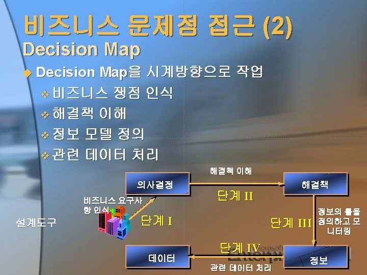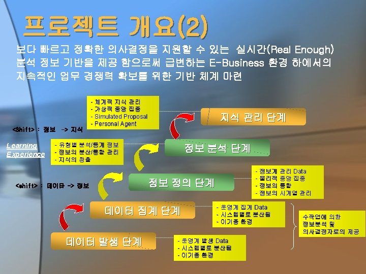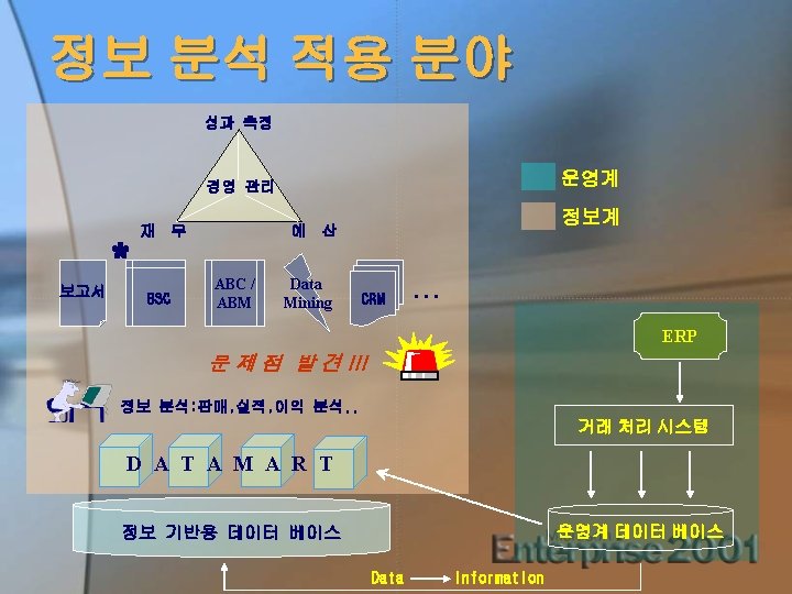 정보 처리? u Not data as it is !! u Informational Processing? u Turning data into information u Turning information into decision/strategy 경쟁력 있는 비즈니스 의사결정은 정보와 그 정 보를 비즈니스 문제점에 적용할 수 있는 지식 이 있을 때 가능