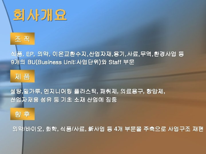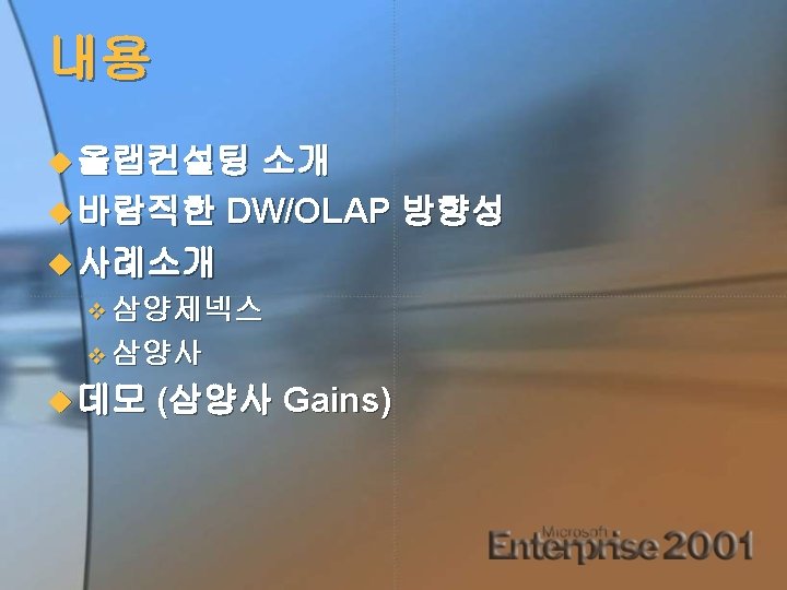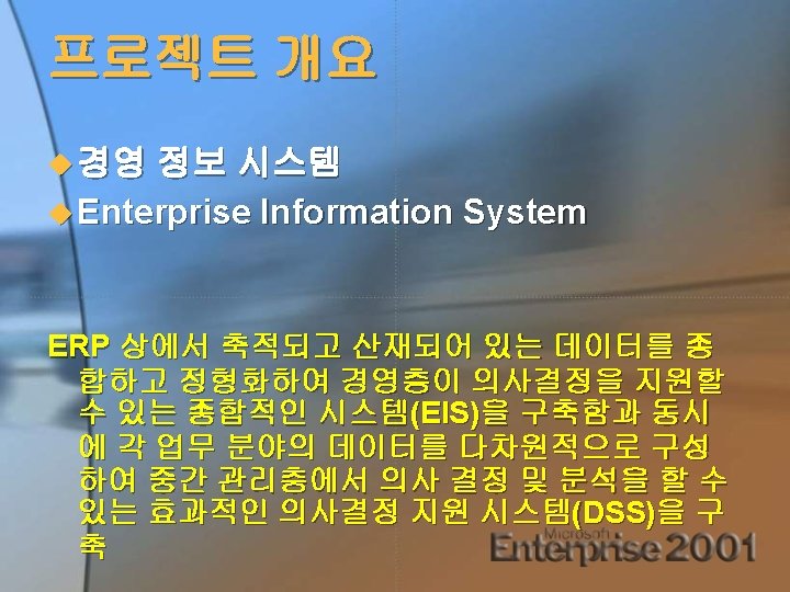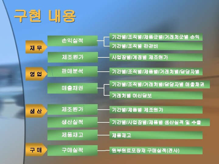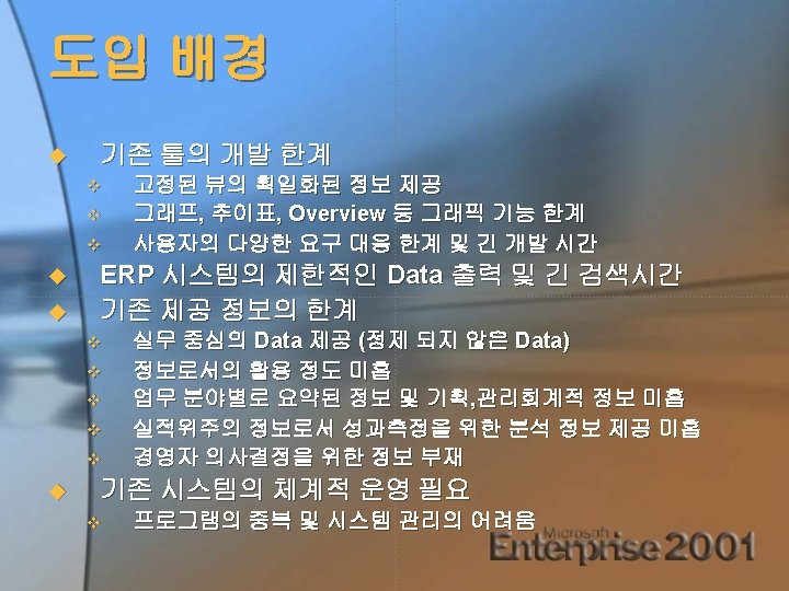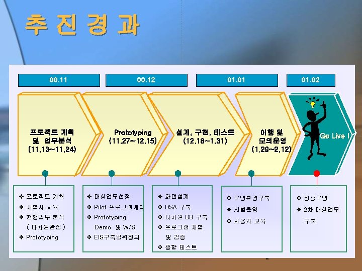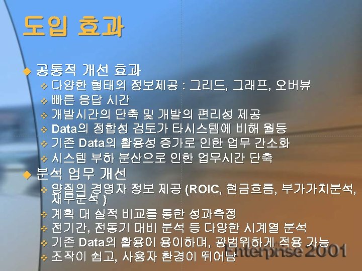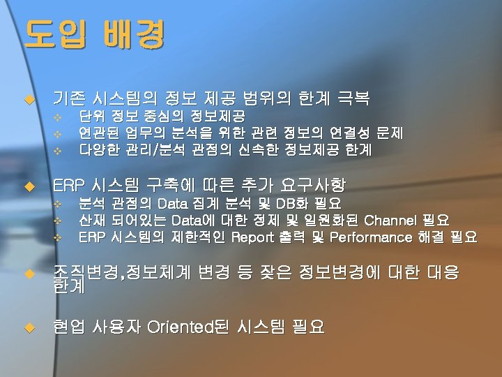 추진경과 TASK ’ 00. 11 ’ 01. 03 ’ 00. 05 ’ 01. 07 q D/W Planning q D/W 설계 q D/W 구축 및 Test q Olap 설계 ERP Open q Olap 구축 및 Test q 통합 테스트 q 사용자 교육/Open ’ 01. 09