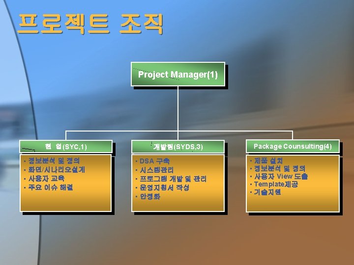 프로젝트 조직 Project Manager Steering Committee 현업(2명) IT-SM(5명) IT-SI(2명) Consulting(2명)