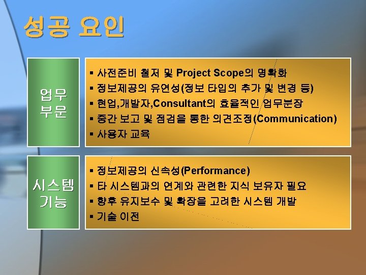주요 사업 분야 OLAP S/W와 Package 판매/ 기술지원 q. OLAP(DW/DM)부문 : Comshare Decision, Decision. Web, Essbase, SQL Server 2000 Analysis Services 등 q예산/재무/손익관리 부문 : MPC(Management Planning & Control), FDC(Financial Data Consolidation), Budget Plus 등 q MPC(Management Planning&Control) System 컨설팅 및 구축 컨설팅/ 기술지원 q OLAP Consulting Service, Data Warehouse 및 Data Mart 구축 q Specialized & Packaged Application Solution 제공 (DSS, EIS, 정원관리, EVA(경제적 투자가치 분석), BSC(Balanced Score Card)관리, 성과측정관리, OLAP/ 제품교육 q 상설 교육, On-Site 교육 q Workshop, 정기 Seminar 실시
