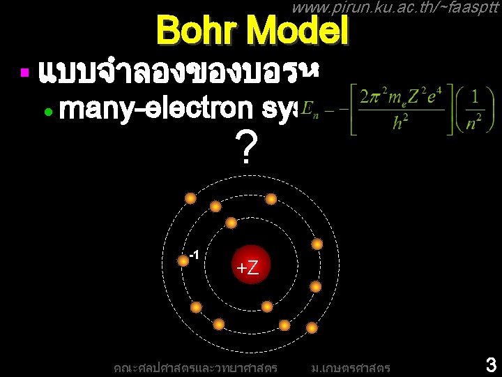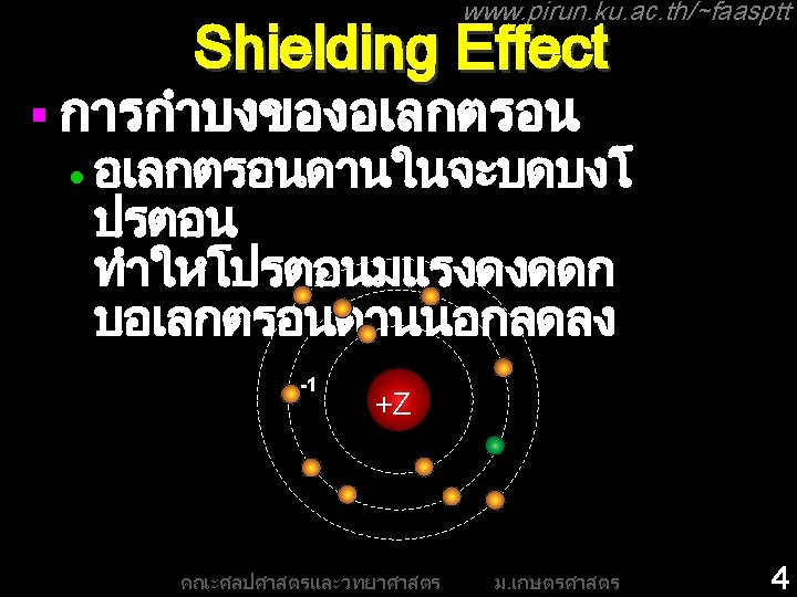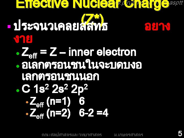 www. pirun. ku. ac. th/~faasptt Effective Nuclear Charge (Z*) § กฎของ Clementi & Raimodi ·S w คำนวณจากสมการคลน S 1 s = 0. 3(N 1 s-1) + 0. 0072(N 2 s+N 2 p) + 0. 0158 (N 3 s, p, d+N 4 s, p) w S 3 d = 13. 5894 + 0. 2693 (N 3 d-1) 0. 1065 N 4 p คณะศลปศาสตรและวทยาศาสตร ม. เกษตรศาสตร 14