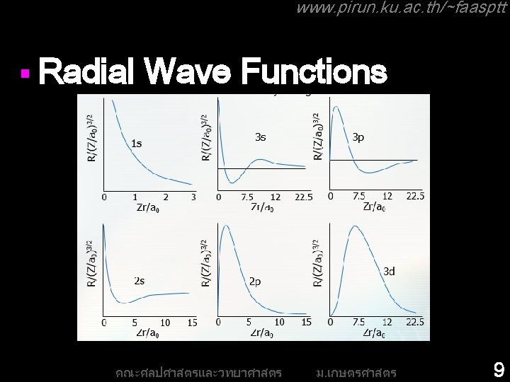 Hydrogenic www. pirun. ku. ac. th/~faasptt Radial n l R orbital Wavefunctions n, l 1 s 1 0 2 s 2 0 2 p 2 1 3 s 3 0 3 p 3 1 3 d 3 2 คณะศลปศาสตรและวทยาศาสตร ม. เกษตรศาสตร 8