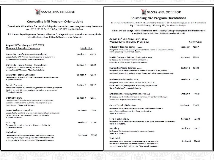Welcome to Santa Ana What Will You Learn from this College! Orientation? • • • Information about Santa Ana College Your responsibilities as a student Important dates & deadlines Review your English & Math Placement Requirements for certificates, degrees and transferring • Education Planning: course selection and on-line registration