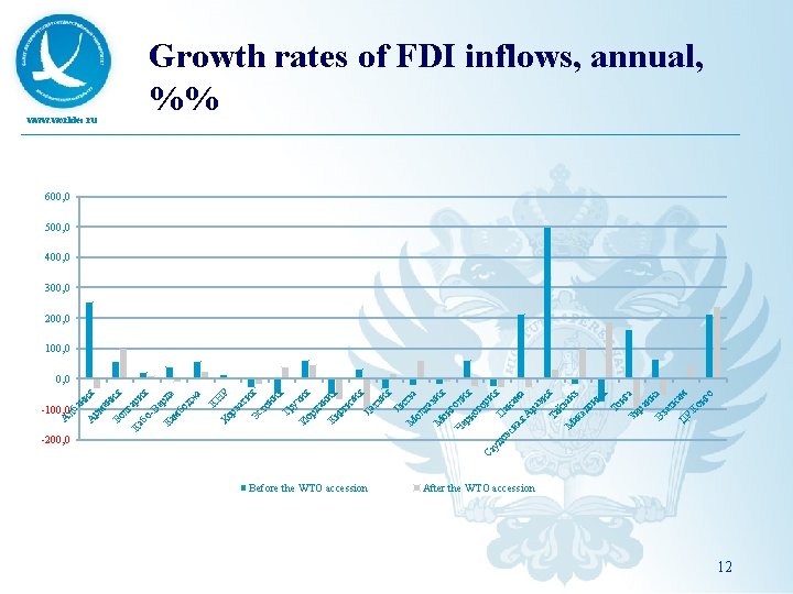 WTO and FDI www. worldec. ru Focus on relative indicators – how did average rate of growth change two years after accession in comparison with two years prior? Positive vs. negative dynamics Data mostly from the same source of UNCTAD statistics 11