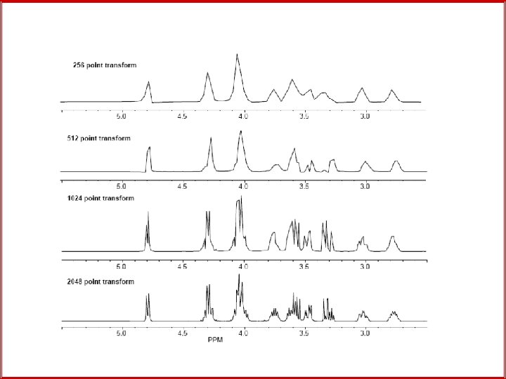 Rozdzielczość cyfrowa widma, dopełnianie zerami TD - rozmiar FIDu (ustalany przed pomiarem) - parametr pomiaru SI - rozmiar widma (parametr obróbki FIDu) SI = TD / 2 (ustawienie standardowe) Możliwe, a czasem niezbędne jest zwiększenie SI, poprzez dopełnianie zerami