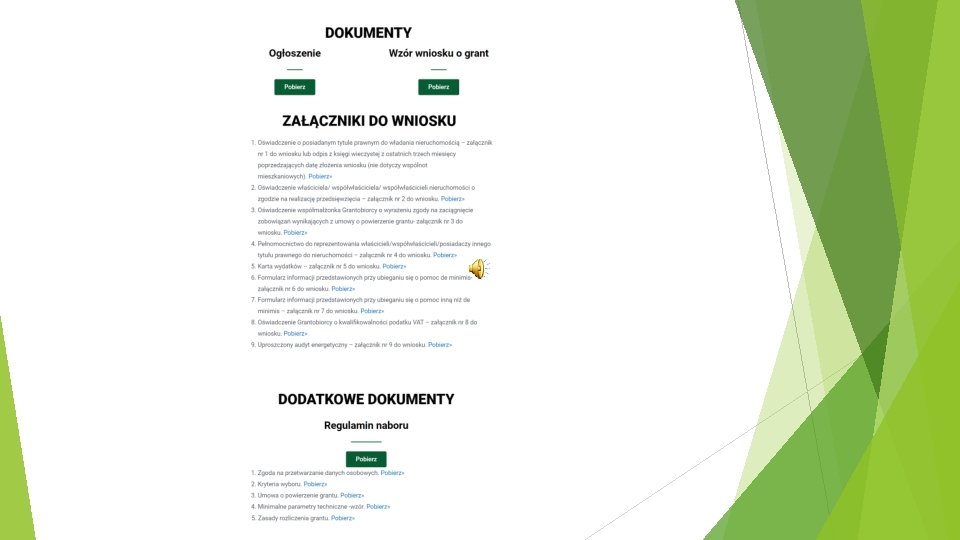 Istotne informacje c. d. wymiana każdego wspieranego wysokoemisyjnego źródła ciepła musi prowadzić do redukcji emisji CO 2 (co najmniej o 30% w przypadku zamiany paliwa), co potwierdza dołączony do wniosku o udzielenie grantu uproszczony audyt energetyczny. Powyższy warunek nie dotyczy podłączenia do sieci ciepłowniczej. wymiana każdego wspieranego wysokoemisyjnego źródła ciepła musi prowadzić do redukcji emisji pyłów zawieszonych PM 10 i PM 2, 5, co potwierdza dołączony do wniosku o udzielenie grantu uproszczony audyt energetyczny. Powyższy warunek nie dotyczy podłączenia do sieci ciepłowniczej. wsparcie można otrzymać na wymianę wysokoemisyjnych źródeł ciepła służących wyłącznie na potrzeby ogrzania pomieszczeń pełniących funkcje mieszkalne w domach jednorodzinnych i/lub wielorodzinnych budynkach mieszkalnych.