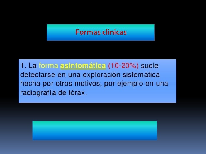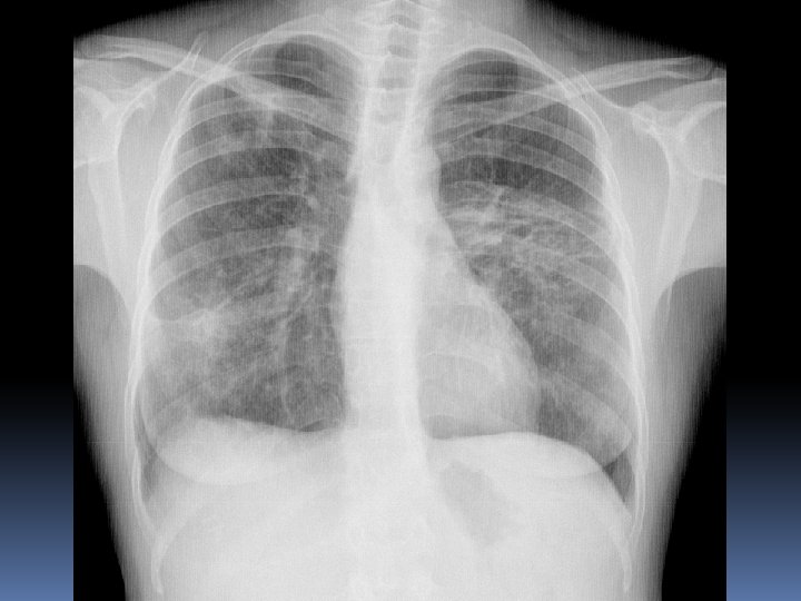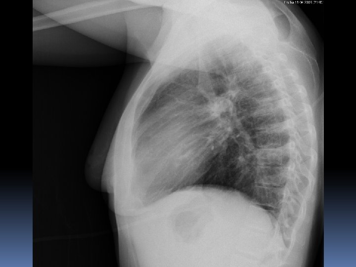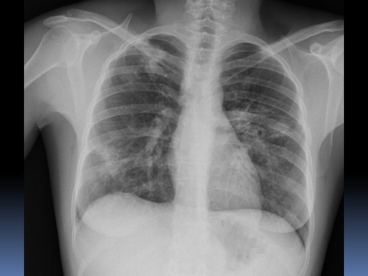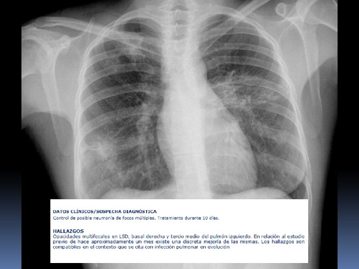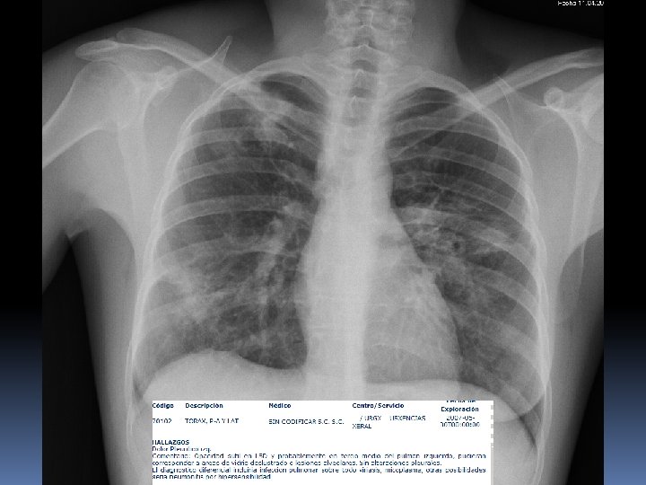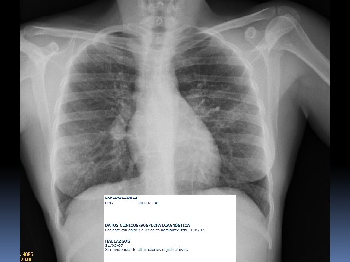 X 2007 Mujer 26 años Astenia, adelgazamiento 5 kg en 3 -4 meses. Nerviosa. Problemas de pareja. Hace 15 dias : tos seca y dolor en costado izquierdo por lo que acude a Urgencias del hospital. No fiebre termometrada. Dolor en costado Izquierdo de características pleuríticas. Auscultación normal. Sat 98%.