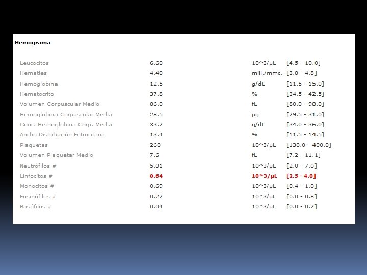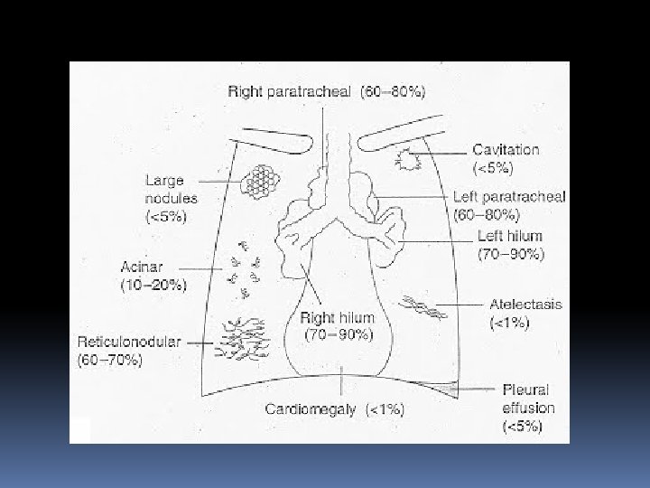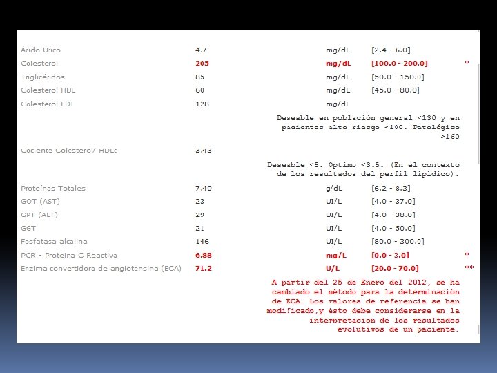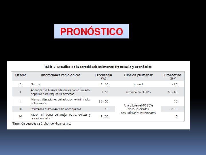 Desde AP: Laboratorio: puede haber anemia, linfopenia, eosinofilia, trombocitopenia, hipergammaglobulinemia, aumento de VSG, hipercalcemia e hipercalciuria, alteraciones específicas de órganos afectados. En 50 -80% de pacientes se detecta un aumento de la enzima conversora de angiotensina (secretada por fagocitos del granuloma), lo que indica un estadio activo. Hacer serologías para posibles diagnósticos diferenciales. Radiografía de tórax: el 90 -95% de los pacientes tiene alguna alteración radiológica en tórax; lo más frecuente es observar un patrón intersticial retículo-nodular y/o adenopatías hiliares bilaterales. Otros hallazgos posibles son: calcificaciones hiliares “en cáscara de huevo”, cavitación, bronquiectasias, derrame pleural unilateral (exudado linfocitario), cardiomegalia, hipertensión pulmonar. En caso de eritema nodoso con radiología normal y etiología no filiada es conveniente repetir el estudio radiológico al mes.