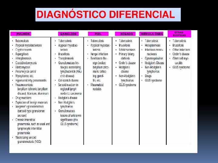 Diagnóstico El diagnóstico de sarcoidosis necesita un cuadro clínico compatible. Demostración histológica de un granuloma no caseificante. Exclusión de otras causas de enfermedades granulomatosas, como infecciones por micobacterias u hongos.